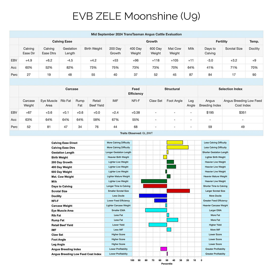 ZELE Moonshine (U9) stands out as a valuable asset, offering traits that improve calving ease, growth rates, fertility, and carcase quality. These attributes make him an ideal selection for boosting herd performance and overall productivity.